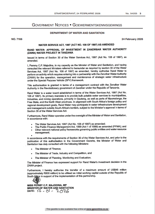 Luidens die goewermentskennisgewing (nommer 7166) gaan Rand Water in ’n vennootskap met ZAWA en is toestemming verleen om ’n bestuurskontrak met ZAWA in die “revolusionêre regering van Zanzibar” te sluit vir die bedryf, bestuur en instandhouding van strategiese waterinfrastruktuur.