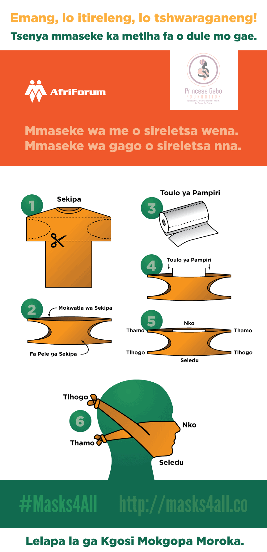 AfriForum and the Princess Gabo Foundation are empowering the Tswana community to fight COVID-19 by creating and distributing instructions in Setswana to community members to make homemade washable masks. The instructions will be distributed and the mask making effort coordinated with the aid of local traditional leadership structures and other community institutions.