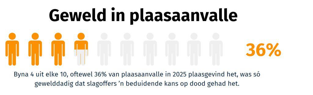 “Ons navorsing toon dat ’n totaal van 29 slagoffers in 2025 dood is in die 184 aangetekende plaasaanvalle. Die kommerwekkende is egter dat die gewelddadige aard van die aanvalle konserwatief gereken in minstens 36% van dié aanvalle sodanig was dat slagoffers ’n noemenswaardige kans op dood in die gesig gestaar het,” verduidelik Nortjé.